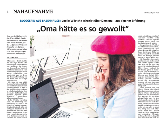 HERZLICH WILLKOMMEN BEI AUF-EIN-WOERTCHEN.DE Ich bin Joelle Wörtche, Journalistin und pflegende Angehörige einer Oma mit Demenz. Die Erkrankung Demenz stellt nicht nur mich sondern uns alle, das heißt unsere gesamte Gesellschaft vor neue…